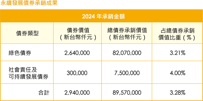 統一證券致力落實永續金融準則,將環境及社會風險等相關評估指標納入投資及承銷等相關業務,透過本公司《永續金融準則》,樹立原則性架構並提供指引,確保內部之 永續金融理念得有效落實,並實踐於各項業務活動中,以達本公司永續經營之目標,進而提升顧客、員工及股東等利害關係人之權益,同時符合國際永續發展趨勢,善盡世 界公民之責任。