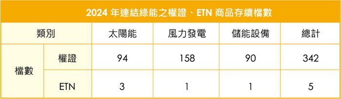 隨著能源轉型議題逐漸受到政府及企業重視,綠能產業之發展亦因而受惠。統一證券廣發連結綠能股票的權證,使投資人於關注綠能產業及能源環保的議題之 餘,得以藉由投資金融商品,共同把握投資機會,參與綠能產業之成長契機。本公司於 2024 年度共有 342 檔存續的綠能連結權證。