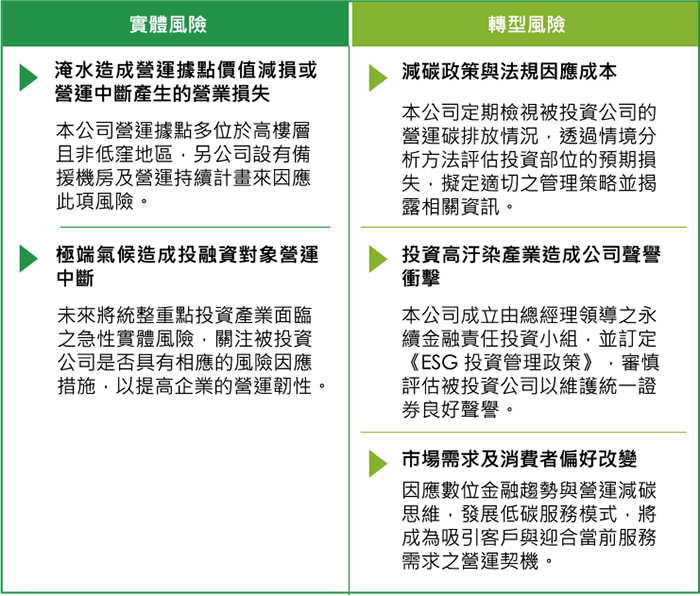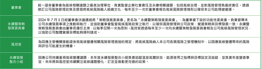 證券商風險範圍涵蓋營運風險、法律遵循風險及環境風險三大面向,2022 年度將氣候風險納入風險管理政策及準則中,並制定衡量及評估流程,彰顯統一證券重 視氣候變遷對整體商業環境造成的影響,以審慎的態度評估及管理商業風險。此外,亦透過內部控制三道防線架構來管理營運所面臨之風險,包含新興氣候風險 之實體與轉型風險。各道防線均各有職責,相關分工請詳本報告書 2.4.1 風險管理政策及組織架構。
