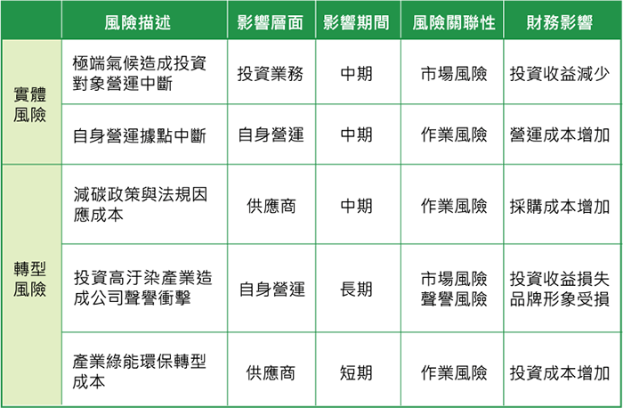 為掌握我們所面臨之氣候相關風險並進一步評估潛在影響,本公司蒐整高氣候風險產業之標竿企業的永續相關揭露以及氣候風險研究報告,並綜合考量產業特 性、氣候風險因子發生之可能性、影響程度與分析資訊之可取得性,從氣候風險清單中篩選出對投資部位具重大影響的氣候風險因子以進行後續量化分析工作。