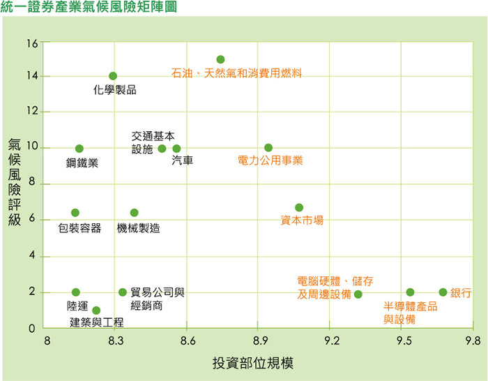 今年度統一證券參考國內外產業別風險報告以及金融市場變化趨勢,彙整 2024年底的投資餘額及產業別資訊,透過被投資公司對外揭露的碳排放資訊以衡量統 一證券現階段所面臨的轉型風險。採用國外產業別風險評級資訊與公司投資餘額,繪製氣候風險矩陣圖,辨識高氣候風險產業並擇定重點關注產業。依分析結 果顯示,半導體、電子業、石化業、發電業和金融業為公司投資標的中之高氣候風險產業。