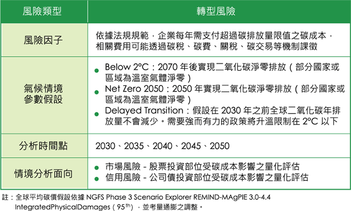 考量各國陸續擬定碳成本徵收相關機制以達成全球升溫限制目標,企業將面臨額外的合規成本,本公司選定以碳成本轉型風險進一步進行情境分析。