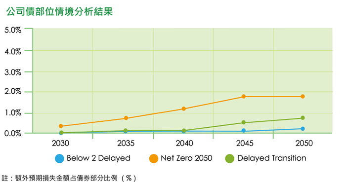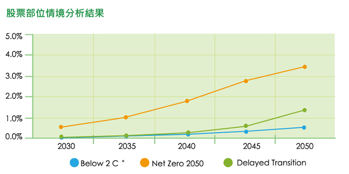 隨著日益趨嚴的碳排法規趨勢,為了掌握投資部位標的公司因應法規而增加的合規額外成本對本公司投資部位的潛在財務衝擊,本公司透過系統化的評估流 程,配合氣候情境進行情境分析,模擬「Below 2°C」、「Net Zero 2050」、「Delayed Transition」各氣候情境的潛在財務損失,藉以作為未來投資組合之 評估考量資訊,以進一步研擬氣候風險的因應策略及措施,強化本公司的氣候風險管理。