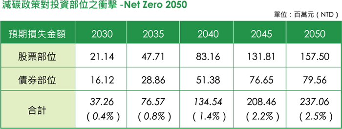 在較為嚴苛的 Net Zero 2050 情境,評估碳成本的增加造成投資部位的預期損失約為 2.37 億,約占當年度淨值 0.67%【淨值 352.89 億】。經風控室評估,轉 型風險所造成的財務衝擊未達淨值 1%,認為該風險仍在可控範圍之中,未來風控室將持續追蹤碳費成本所造成投資部位的衝擊。未來本公司將持續強化風險管 理,並聚焦投資對象之 ESG 指標與氣候調適行動,藉以減緩氣候變遷對本公司債券投資部位的影響。