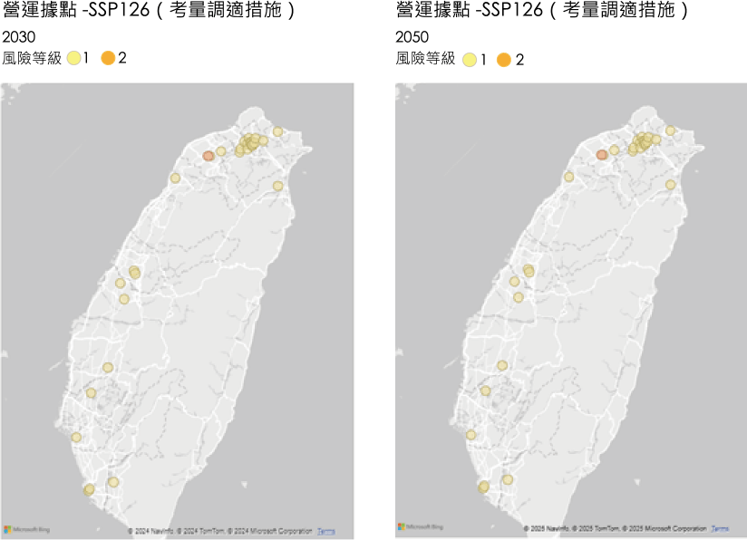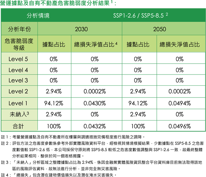 本公司選用 SSP1-2.6(升溫 2℃ 內)及 SSP5-8.5(升溫 4℃ 內)情境進行氣候實體風險情境分析,並參考金融業風險資訊整合平台實體風險資料庫,與高淹水風 險之地區套疊比對,分析營運據點及自有不動產之危害度與脆弱度。