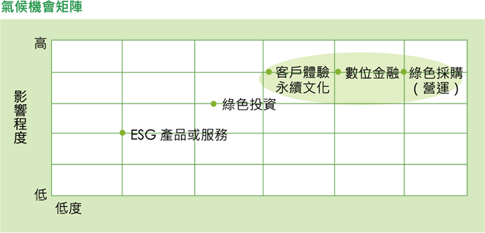 統一證券積極尋找氣候轉型機會,透過問卷方式及跨部門整合會議,依循各部門專業蒐集並評估機會發生之可能性及各部門研擬之政策。透過各部門分析討論 後,統一證券辨識出氣候變遷帶來高度正面影響且發生可能性較高之項目有:綠色採購及營運、數位金融以及永續文化。未來本公司各部門仍持續關注氣候變遷 議題及金融市場變化,掌握氣候變遷下相關議題並擬定因應策略以持續發展相關業務機會。