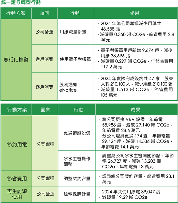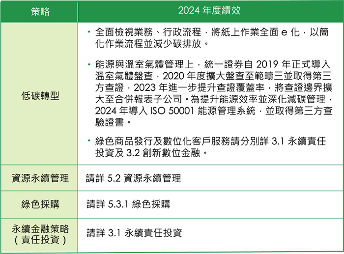 在低碳轉型的政策,於客戶面:現階段以發展數位金融服務為主要方向,包含線上開戶、線上簽署各類同意書及主管機關要求的風險預告書、直接於行動裝置進行各 類交易、電子對帳單查詢等服務,未來將逐步擴展永續金融的業務範疇與類型,朝具永續或環境效益之產品方向發展。在公司營運面:全面檢視業務流程,推動行政 表單 e 化、採購具環保或節能標章產品,並逐年汰換高耗能設備,以減少能源耗損,精簡能源費用支出,提升營運效能。同時,導入 ISO 14064-1 溫室氣體盤查、 ISO14001 環境管理系統與 ISO 50001 能源管理系統,並通過第三方查驗機構驗證,建立系統化的低碳管理機制,持續強化碳管理與環境治理能力,朝向低碳營運目標 邁進。