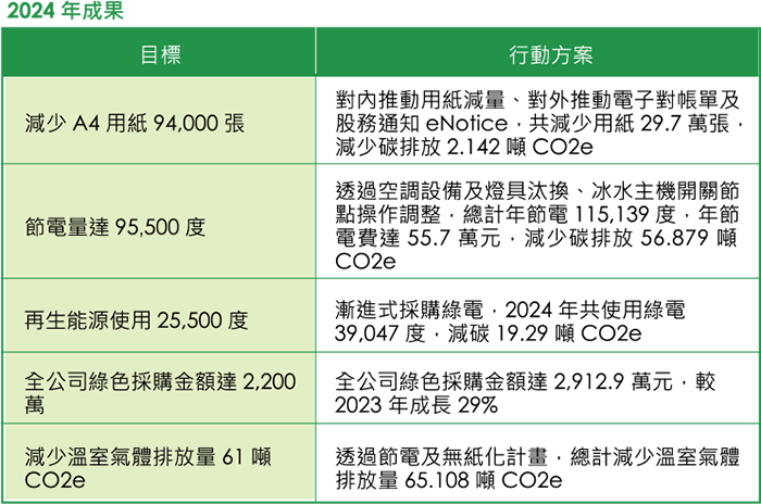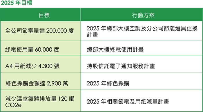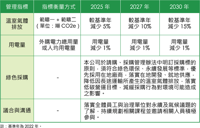 公司亦將 2022 年作為目標基準年,部署規劃減量行動,目標 2025 年範疇一、二溫室氣體排放減量較基準年減量 5%、2030 年減量 15%。