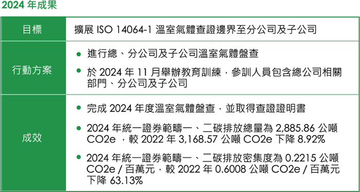 2022 年參考「上市櫃公司永續發展路徑圖」,將溫室氣體盤查範圍擴大至分公司及在台子公司,並於 2023 年擴大查證範圍,使溫室氣體排放量揭露範圍與公司合 併財務報表範圍一致,查證覆蓋率 100%。