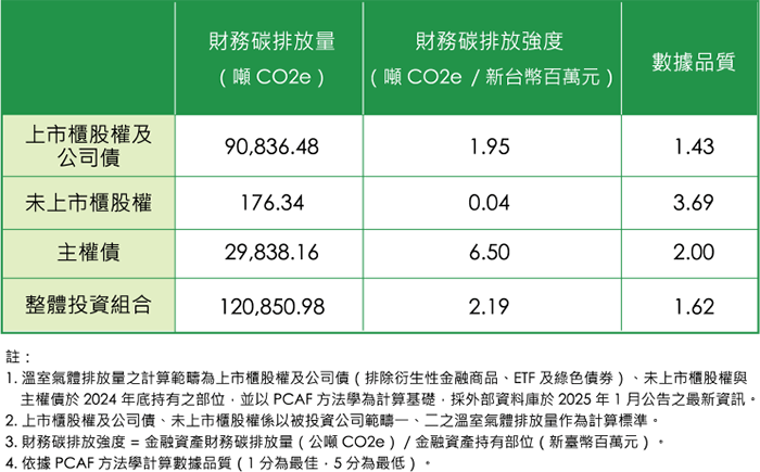 盤查範疇包含上市櫃股權及公司債與主權債,符合 PCAF 方法學之覆蓋率 為79.41%,已依據 PCAF 方法學盤查覆蓋率 達 79.40%,整體數據品質分數為 1.62。