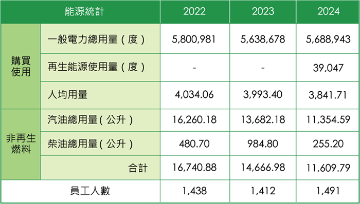 再生能源方面,2024 年共使用 39,047 度綠電,目標 2030 年總公司綠電占比 15%。檢視 2024 年非再生燃料數據,汽柴油總用量為 11,609.79 公升,較去年下降 20.84%,主要變動如下: