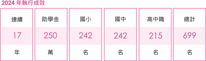 自 2001 年起,統一證券便與各式公益團體合作,針對經濟弱勢家庭辦理獎助學 金,並號召統一證券事業群之子公司於每年度十月份共同參與。活動參與人除員 工外,更擴大邀請員工眷屬及客戶共同參與,公司亦額外就參與人數提撥每一人數贊助金 200 元作為經濟弱勢家庭之獎助學金,每年度皆有相當豐碩的成果。 2020 年起改變活動辦理形式,獎助學金改由公司全額捐贈款項。此外,本公司自 2008 年起,亦與家扶基金會共同成立「統一證券經濟弱勢家庭國小學生獎助學 金」,並於 2010 年起擴大至國中學生、2013 年起嘉惠至高中學生,為弱勢兒少提供學習資源。累計截至 2024 年年底,統一證券及子公司共協助了 6,729 名國 小清寒兒童、3,295 名國中清寒學童,以及 2,150 名高中職清寒學生,累計已幫助 12,174 名弱勢學童。