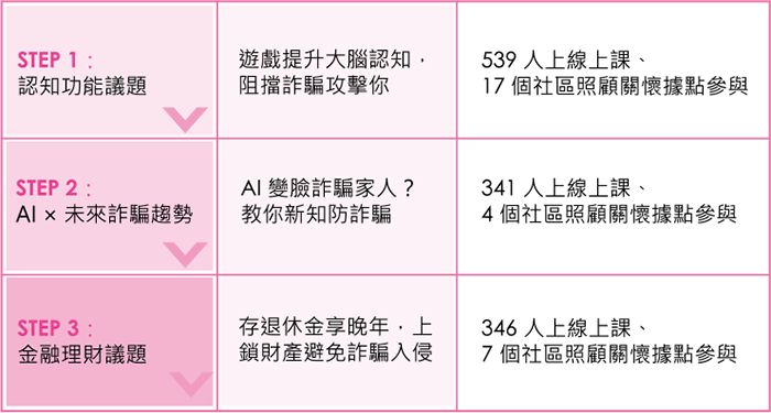 2024 年統一證券攜手數位人道協會推廣防詐教育,結合雙方核心能力與專業,透過 WaCare 數位健康生態圈平台,聚焦高齡族群推廣防範投資詐騙知識。雙 方合作開設「防詐騙三部曲 LIVE 課程」,以提升長者對詐騙手法的辨識與預防意識為出發,循序介紹新型詐騙情境,並延伸至退休後財產規劃等實務議題,打造 從認知建立到資產守護的完整過程。課程從日常生活切入,預防高齡金融剝削,強化銀髮族財務安全意識與保護力。三堂系列課程共吸引超過 2,500 人報名,並 有超過 1,200 人、來自 28 個社區據點參與線上課程。課後亦將課程影片上架平台提供回放觀看,開放更多民眾免費學習,擴大防詐教育影響力。