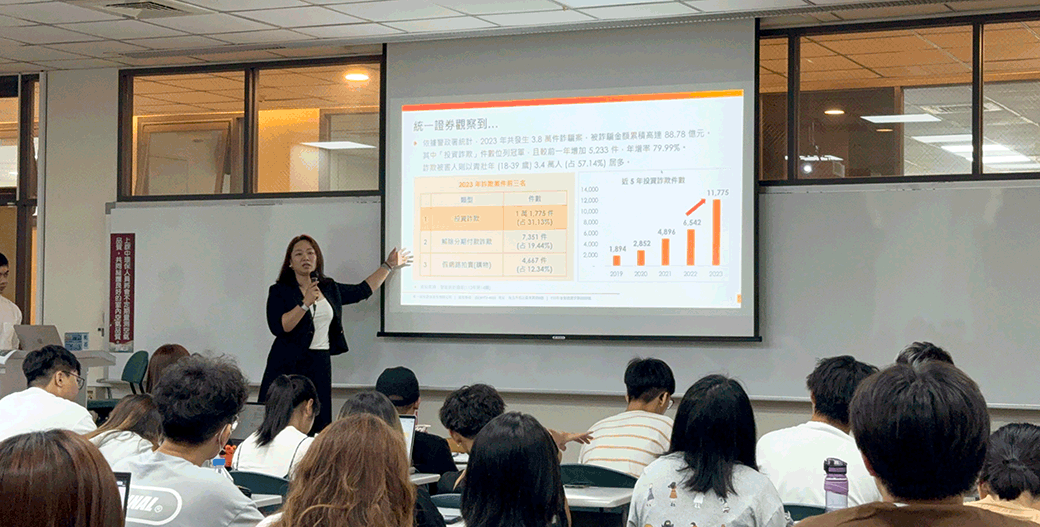 統一證券同時也關注新世代,2024 年與工商時報合作舉辦「守護資產.信守未來」校園徵影活動,擔任企業導師並提供「防範投資詐騙故事」策略單命題,邀請青年學子發揮創意製作影片,走入校園 推廣防詐概念。本屆徵影特別新增「防詐」主題,以「產業出題、學生做題」為概念,引導學生以創意手法轉化嚴肅議題,提升其金融風險辨識力。活動期間亦透過校園說明會,由客服中心同仁向學生分享 投資詐騙案例,及親身參與詐騙群組的實務經驗,以輕鬆詼諧的方式傳遞反詐知識,強化學生實務應對能力。