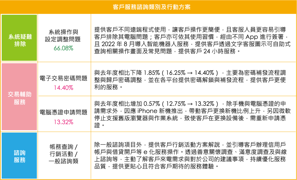 此外,本公司之客服時間特延長至晚上 8:00,讓客戶下班後也能聯繫服務人員,即時解決各項系統疑問及協助線上開戶等程序,落實貼心客戶服務,深獲各界好 評。2024 全年度之客服電話總進線數 63,597 通,接通數 55,872 通,接通率達87.9%。其中詢問項目與比例為:系統疑難排除類 66.08%、交易輔助服務類(CA 憑證、密碼)27.72%、諮詢服務類 6.09%、客戶申訴 0.11%