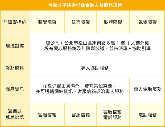 為提供高齡或身心障礙客戶便利之環境,本公司已於全台營業據點之開戶櫃台配置平板電腦、老花眼鏡及放大鏡等輔助工具,提升文件可閱讀性,強化無障礙服務品質。2024 年進一步依身心障礙者個別需求,提供更適切之友善服務措施,並與台灣手語翻譯協會攜手合作,提供「視訊手語翻譯」或「現場手語翻譯」服務。客戶可於營業日 24 小時前 透過官網客服中心線上留言,或由營業員或家人來電客服中心提出申請,營造包容且友善之服務環境。