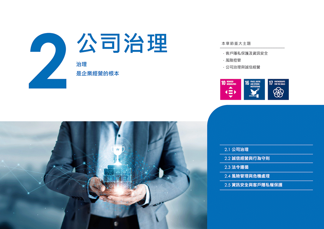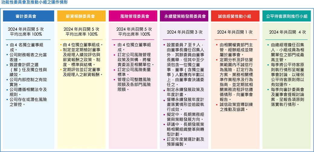 為落實董事會之督導職能,本公司之董事會下設有「審計委員會」、「薪資報酬委員會」、「風險管理委員會」及「永續暨策略發展委員會」等四大功能性委員會, 委員會成員由各董事及獨立董事所組成;此外亦設有「誠信經營推動小組」及「公平待客原則推行小組」,定期向董事會報告組織內部各項政策與工作實施成效。