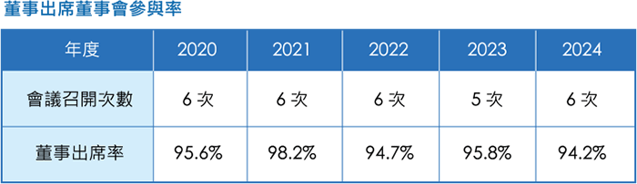 2024 年本公司共計召開 6 次董事會會議,整體董事之實際出席率為 94.2%(含委託出席則出席率為 100%),其中獨立董事實際出席率 95.8%(含委託出席則出席率為100%)。 董事會議事錄均置於本公司官網投資人專區中,會議決議事項皆已列管追蹤辦理。