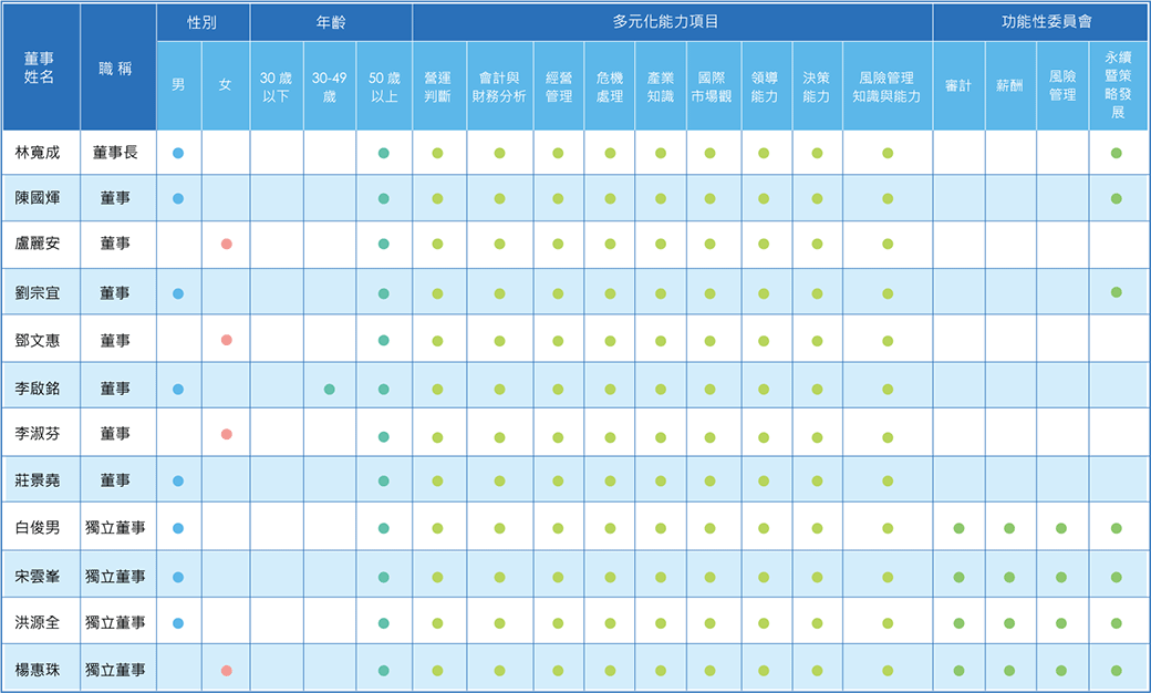 註:本公司依據金管會發布之「公司治理 3.0- 永續發展藍圖」,於 2023 年 5 月 31 日股東會修訂《公司章程》, 調整董事會席次,設董事十二名,其中獨立董事四名、非獨立董事八名,並於 2024 年 6 月股東會進行董事改選 時適用。