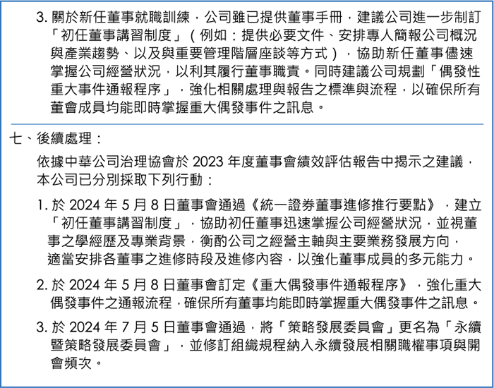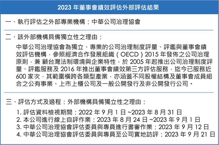 另依據《董事會績效評估辦法》,本公司應至少每三年定期委由外部專業獨立機構或外部專家學者團隊執行一次評估。本公司業於 2023 年聘請外部專業機構中 華公司治理協會進行績效評估,並於 2023 年 10 月 2 日出具董事會績效評估報告書,並將評估結果提報 2023 年 11 月 8 日第 12 屆第 13 次董事會,且於年報 及公司網站揭露。