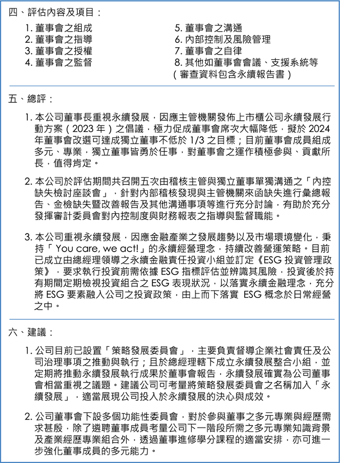 本公司每年度執行一次內部董事會績效評估,績效評估程序應於次一年度第一季結束前完成,評選結果將於年報或公司網站或公開資訊觀測站揭露,個別董事之 內部評估結果將作為本公司董事會遴選或提名獨立董事時之參考依據。本年度評估期間為 2023 年 7 月 1 日至 2024 年 6 月 30 日,評估結果已提報 2024 年 11 月 6 日第 13 屆第 3 次董事會,並於年報及公司網站揭露。