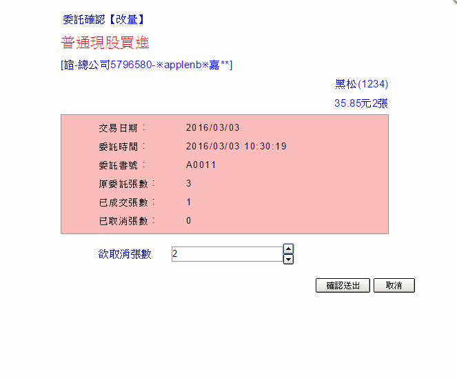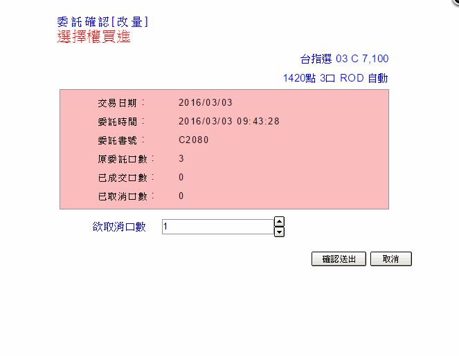 按鈕,系統彈出改量小視窗,可以將該筆委託尚未成交的數量進行「改量」。