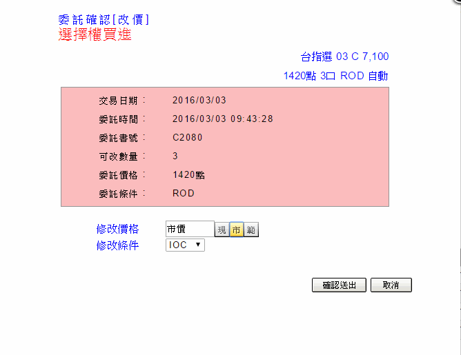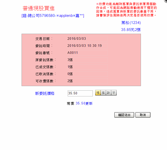 按鈕,系統彈出改價小視窗,可以將該筆委託尚未成交的數量進行「改價」。