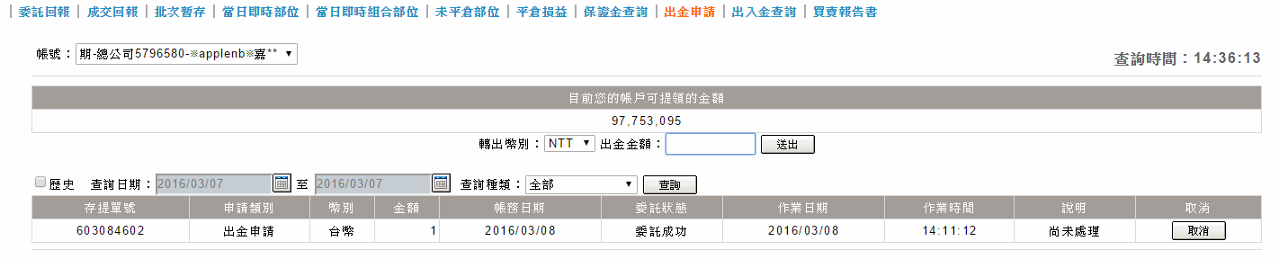以滑鼠左鍵點擊"送出"鈕,送出出金委託。