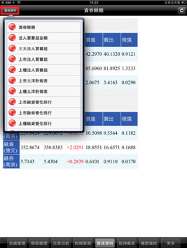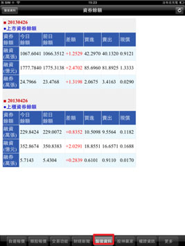 點選下方功能選單【盤後資料】,即可觀看盤後資料內容。預設功能為「資券餘額」