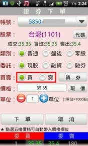 選擇買賣別:買/賣。選擇買時底色為粉紅色,選擇賣時底色為粉綠色