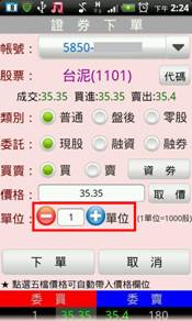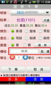 輸入價格。亦可點選右側【取價】鈕選擇:現價/漲停/平盤/跌停