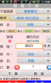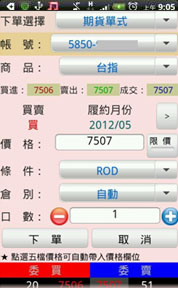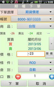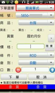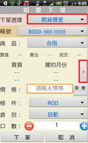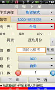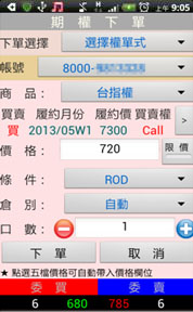 於選單選擇商品別/買賣別/履約月份/履約價/買賣權/價格/條件/倉別/口數。按【確認送出】即可將委託單送出