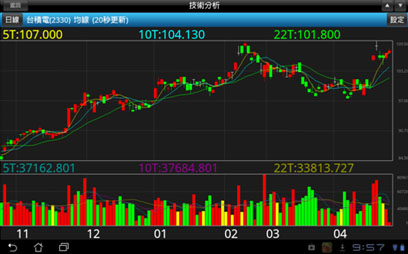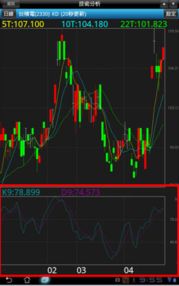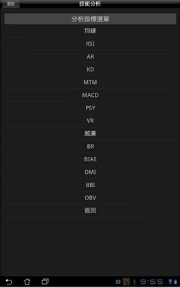 可由彈出之分析指標選單切換為均線/RSI/AR/KD/MTM/MACD/PSY/VR/威廉/BR/BIAS/DMI/BBI/OBV