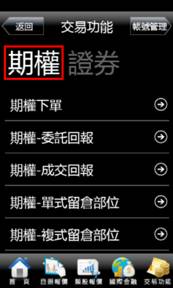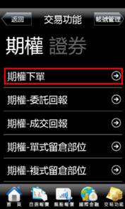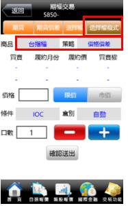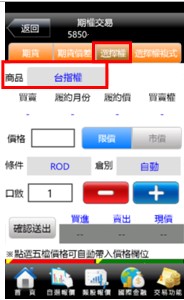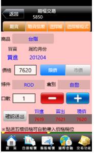 於選單選擇商品別/買賣別/履約月份/履約價/買賣權/價格/條件/倉別/口數。按【確認送出】即可將委託單送出