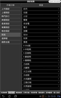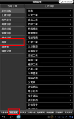 點選下方功能選單【類股報價】。再選擇「期貨」>期貨標的